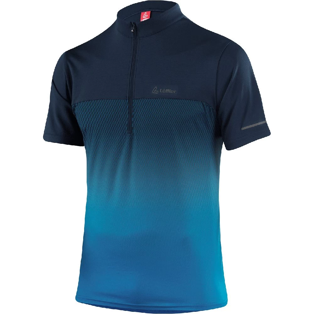 The Löffler cycling jersey for men impresses with its soft wearing comfort, stand-up collar, half zip, zip back pocket, open cuffs and waistband and reflectors.