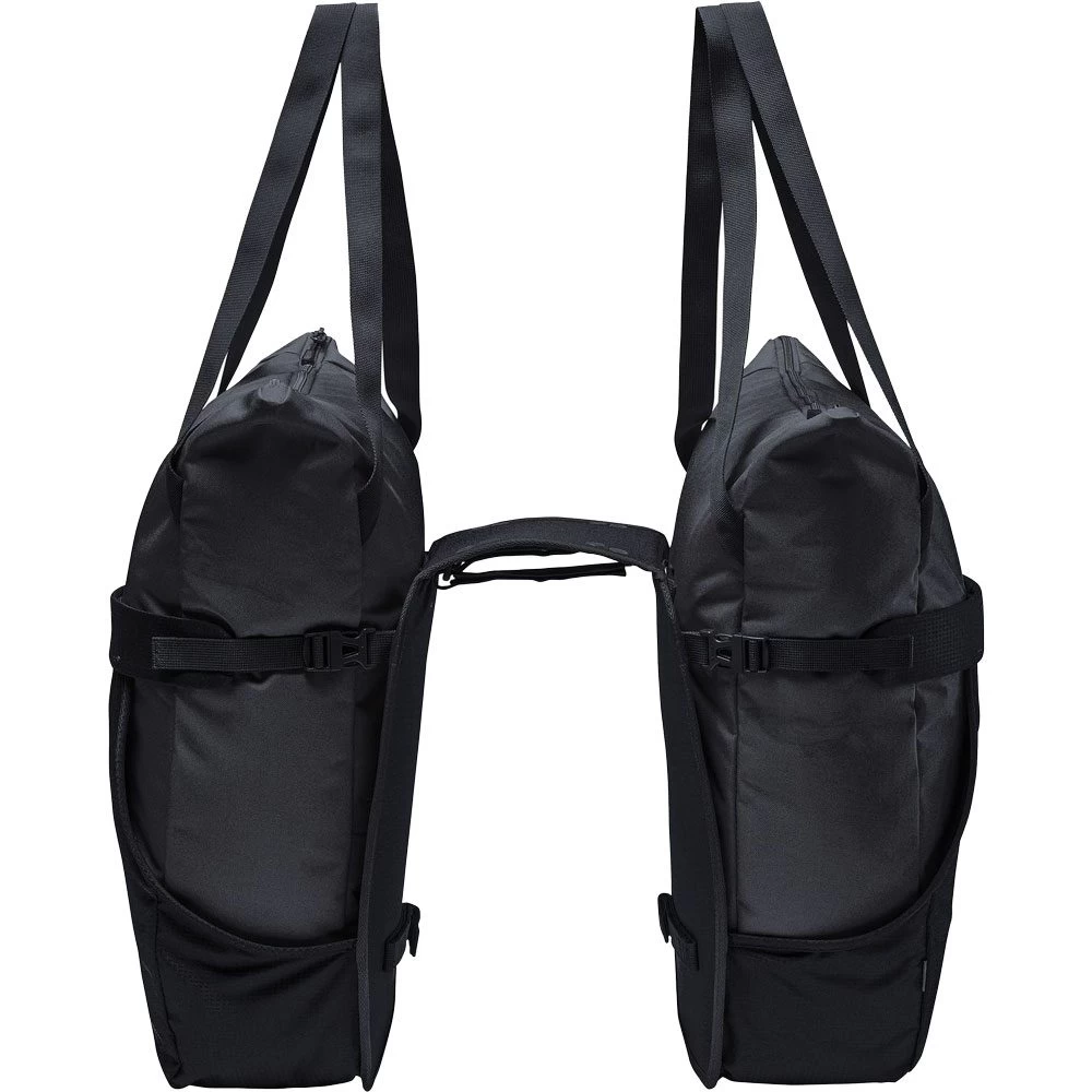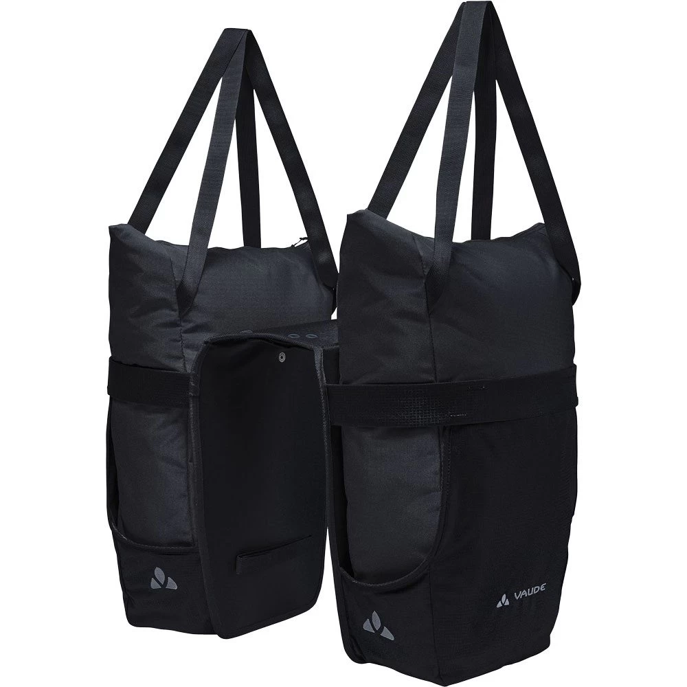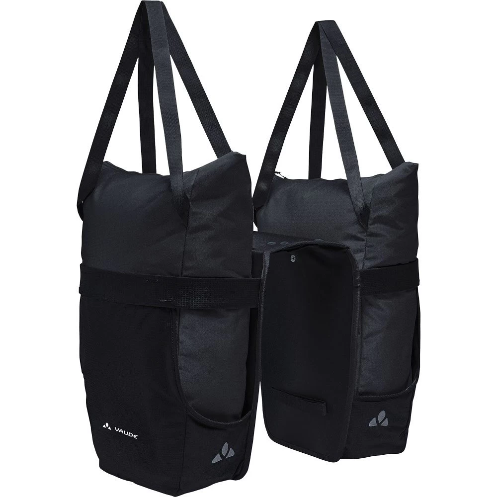 Innovative principle meets modern design – the double pannier TwinShopper will not only swallow all your purchases as the market – it’s also perfect for a trip to the gym. The best feature of all – the chic bags can be detached separately for shopping or sports. They’re incredibly easy to attach and remove from your bike. Just attach the bar connecting the two holsters to your gear rack and secure it closed at the top and underneath at the sides. With 4 integrated eyelets, it also offers the possibility of retrofitting other systems (Uniklip, MIK, Snap-it, Snap-it II, I-Rack). The detachable bags with zip closure can be worn comfortably over the shoulders with two longer straps. For heavier, larger loads, the holsters can be opened for side loading and compressed with a drawstring. The bags are also attached to the holster with snaps. Reflective elements and a rain cover made from 100% recycled polyester ensure greater visibility in low light conditions. The VAUDE Green Shape label stands for environmentally-friendly, functional products made from sustainable and bluesign® certified materials. As a member of the independent Fair Wear organization with Leader Status, VAUDE is committed to fair working conditions and fair wages. In addition, this product is climate neutral. We’ve analyzed and systematically reduced all emissions arising from materials, manufacturing, and shipping. Emissions that are currently unavoidable were fully offset by the independent non-profit organization myclimate.