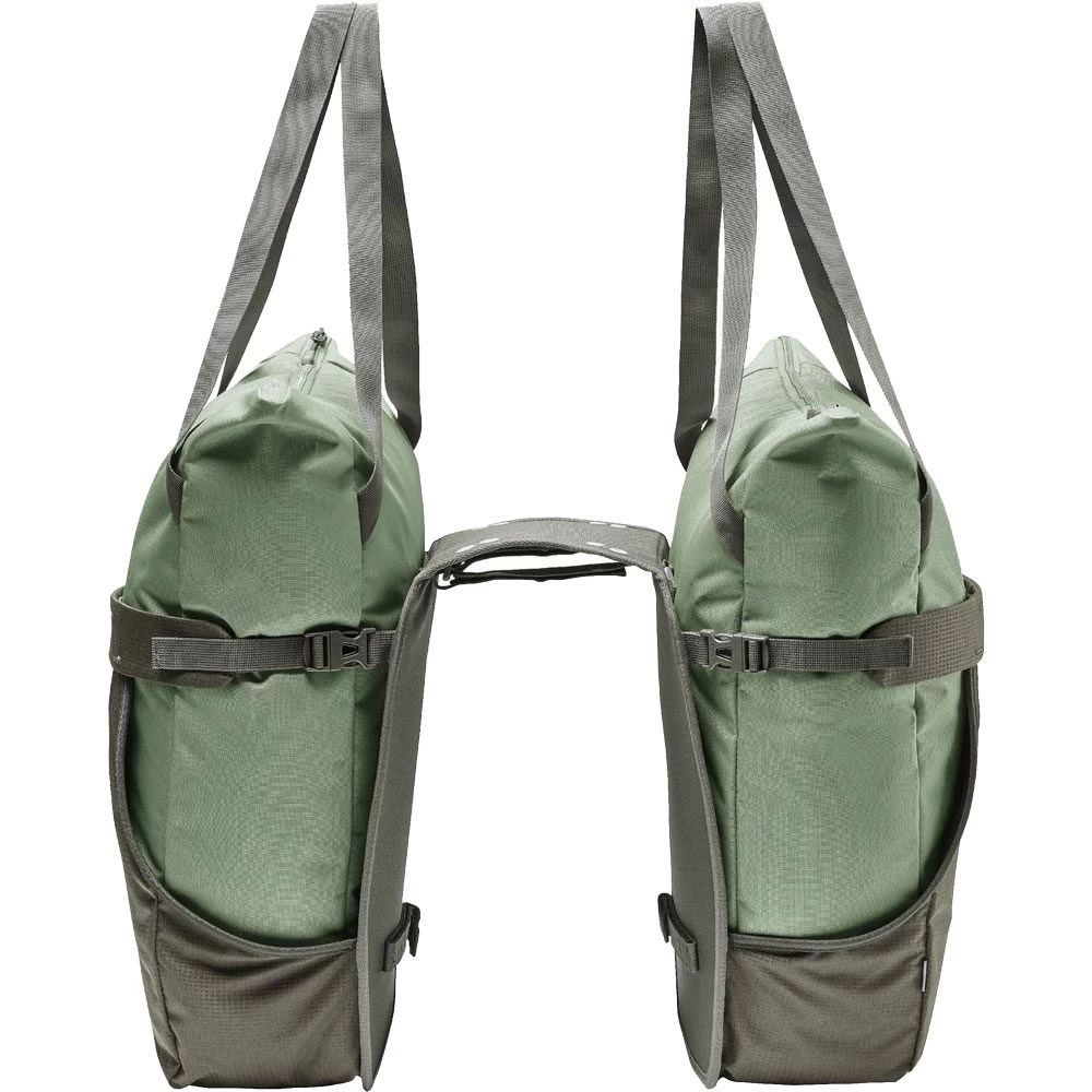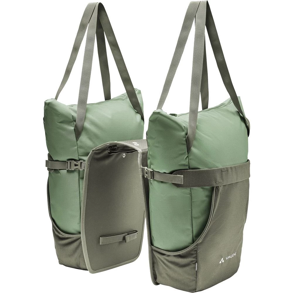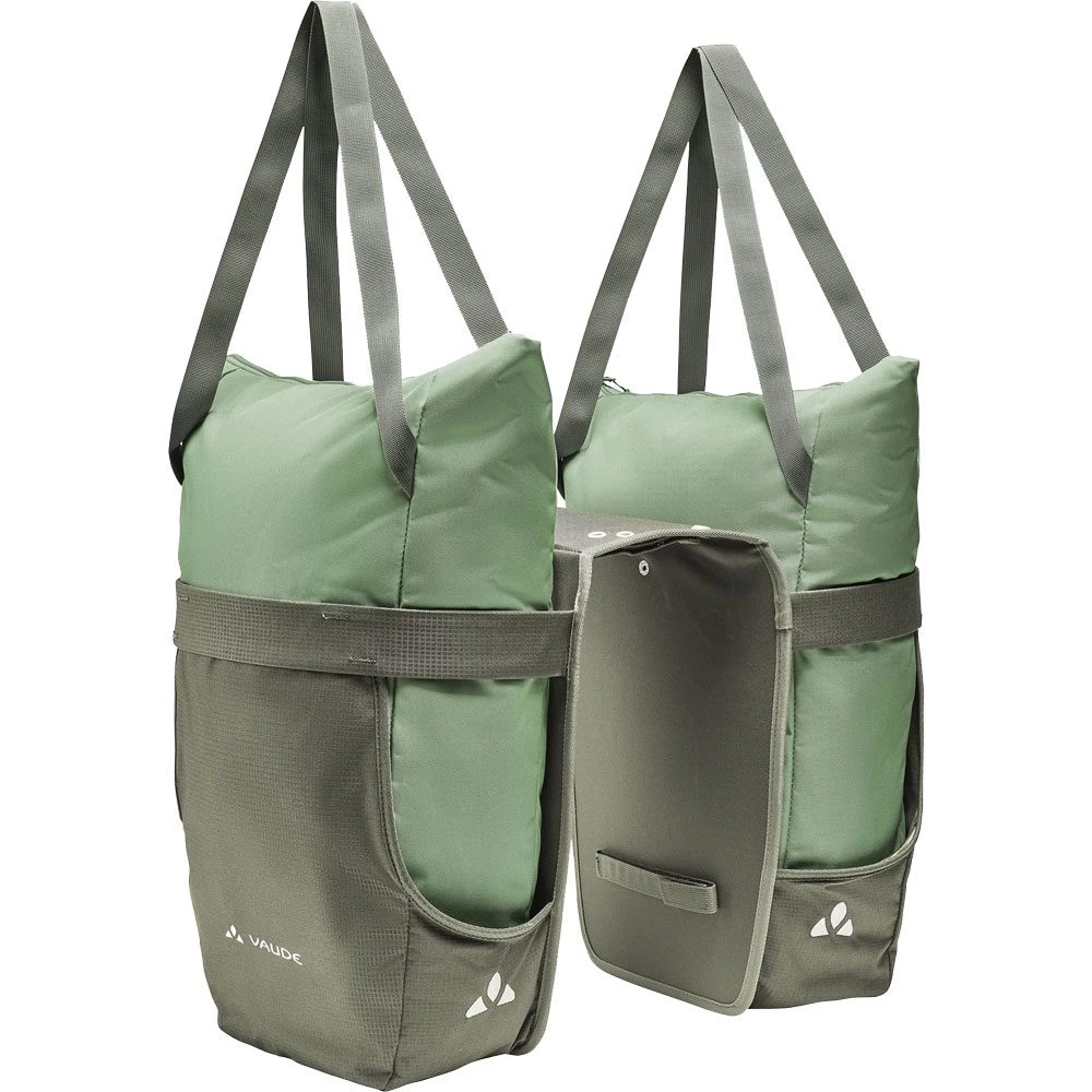 Innovative principle meets modern design – the double pannier TwinShopper will not only swallow all your purchases as the market – it’s also perfect for a trip to the gym. The best feature of all – the chic bags can be detached separately for shopping or sports. They’re incredibly easy to attach and remove from your bike. Just attach the bar connecting the two holsters to your gear rack and secure it closed at the top and underneath at the sides. With 4 integrated eyelets, it also offers the possibility of retrofitting other systems (Uniklip, MIK, Snap-it, Snap-it II, I-Rack). The detachable bags with zip closure can be worn comfortably over the shoulders with two longer straps. For heavier, larger loads, the holsters can be opened for side loading and compressed with a drawstring. The bags are also attached to the holster with snaps. Reflective elements and a rain cover made from 100% recycled polyester ensure greater visibility in low light conditions. The VAUDE Green Shape label stands for environmentally-friendly, functional products made from sustainable and bluesign® certified materials. As a member of the independent Fair Wear organization with Leader Status, VAUDE is committed to fair working conditions and fair wages. In addition, this product is climate neutral. We’ve analyzed and systematically reduced all emissions arising from materials, manufacturing, and shipping. Emissions that are currently unavoidable were fully offset by the independent non-profit organization myclimate.