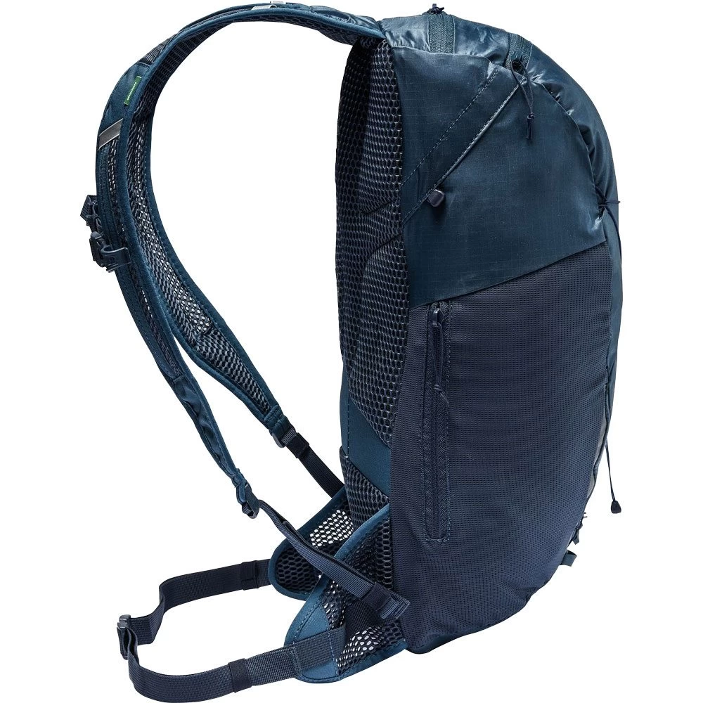 Whether your tour includes biking or hiking – the Uphill 16 bike backpack weighing in at just 420 grams will serve you well on your next trip to the mountains. With minimalist features, the backpack is nevertheless comfortable. The main compartment with an asymmetrical opening offers a volume of 16 liters; a flat, stretchy mesh pocket and a zip side pocket provides access to your phone or snacks without having to take off the pack. The front lacing scores with triple functionality: storage for a wind or rain jacket when the main compartment is full, compression for smaller loads and attachment for trekking poles. 3 D mesh on the back and shoulder straps provides good ventilation for biking or hiking. Reflective elements integrated into the design, a hydration system port and integrated rain cover round out the features of this multi-talent. All materials have a high recycled content. The ultralight siliconized main material of this lightweight pack was made using a certified mass balance process in which pyrolysis oil is extracted from end-of-life tires and fed into a conventional polyamide production process. Chemical recycling reduces CO2 emissions by up to 60%. In addition, this product is climate neutral. We’ve analyzed and systematically reduced all emissions arising from materials, manufacturing, and shipping. Emissions that are currently unavoidable were fully offset by the independent non-profit organization myclimate. The VAUDE Green Shape label stands for environmentally-friendly, functional products made from sustainable and bluesign® certified materials.